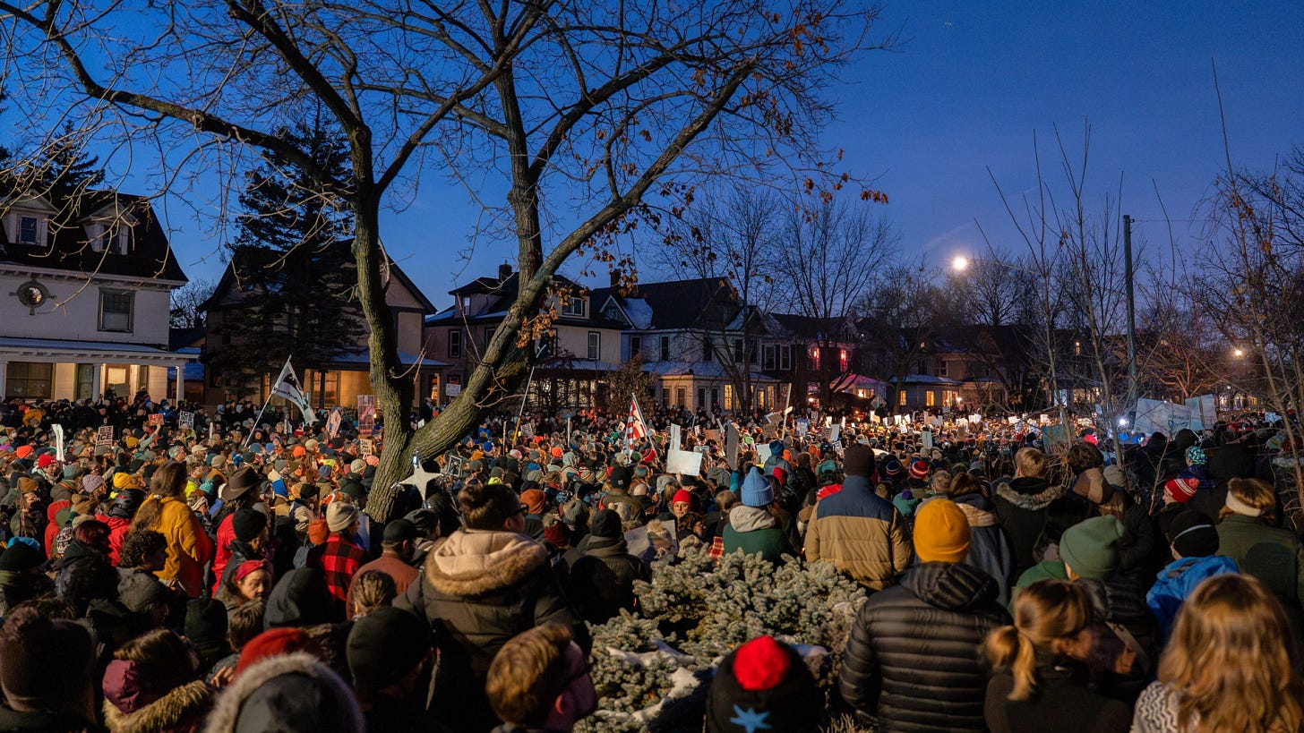 The Minnesota story is developing hour by hour. The escalation of repression, including more and more shooting of unarmed civilians, massive invasion by additional ICE agents, and Trump’s threat to invoke the Insurrection Act, seem to have enraged large swaths of the state’s population without intimidating them into acquiescence. Mass action responses have been cascading. Rapid response networks and neighborhood ICE watch groups, armed with cameras and whistles, are proliferating. A friend in St. Paul wrote to me that there are 1,100 rapid response anti-ICE volunteers in their neighborhood alone.